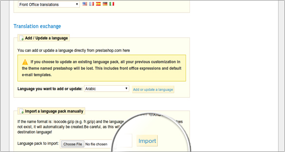 You can easily add more languages to your PrestaShop website. To do that you have to download the required language pack file (in .gzip format) from the PrestaShop official website. Once you have downloaded the file, you have to login to the admin area of your shop. Choose Tools -> Translations. Now, simply browse to the language pack file in your local computer and press the Import button.
