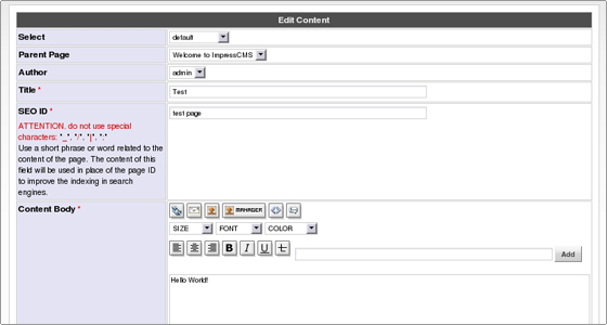 Let’s call our page “Test” and select “Welcome to ImpressCMS” as parent item. For content let’s put “Hello World”.