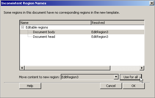 On the Inconsistent Region Names window choose template region and click on “Use for all” button. Then click on OK.