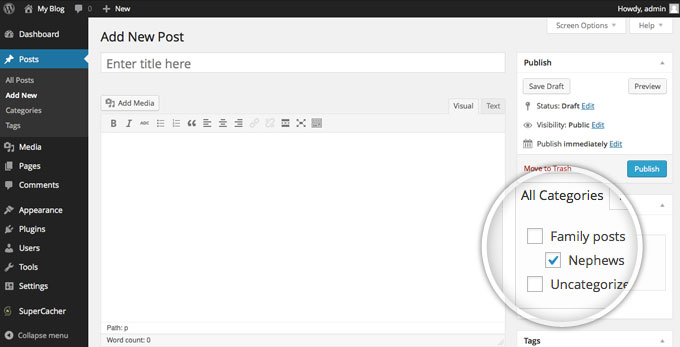 Once you have the category structure created, you can add posts to categories. There are two ways you can do this. The first one is to open a particular post (or write a new one) and place a checkbox in the category you want to assign it to.